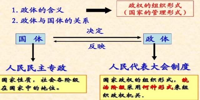 一个国家的性质是这个国家的国体,一个国家的政权组织形式是这个国家的政体。我国国体是工人阶级领导的、以工农联盟为核心的人民民主专政的社会主义国家,与之相适应的政体是人民代表大会制度。