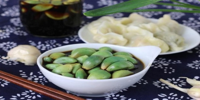 在放置了大概20天左右后,腊八蒜就制作完成了。此时打开容器,可以看到蒜瓣已经变成了翠绿色,而且口感香脆可口。