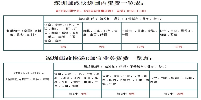 邮政快递收费标准:单件重量不超过1千克的包裹,收费12元-15元。边远地区收费比同省地区要贵一些。采用顺丰、邮政EMS快递收费要贵一些,邮政经济快递相对便宜。保价物品按寄送货品的千分之五来收费。省份面积小于70万平方公里的省内寄递(除新疆、西藏、内蒙古和青海以外所有省份),首重1千克5元,每续重1千克1元。省份面积大于70万平方公里的省内寄递(新疆、西藏、内蒙古和青海四省、自治区),首重1千克6元,每续重1千克1.5元。