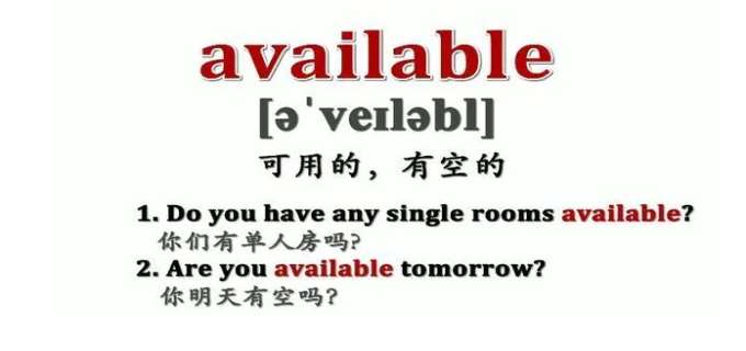 available的基本意思是在一定的时间或场合是“可以使用的”。修饰物时,可指“现成可用的;在手边的;闲着的”,也可指“所获得的;易所得到的;可找到的;可购买的”;修饰人时,意指“有空的”,即“可会面的,可与其交谈的”。